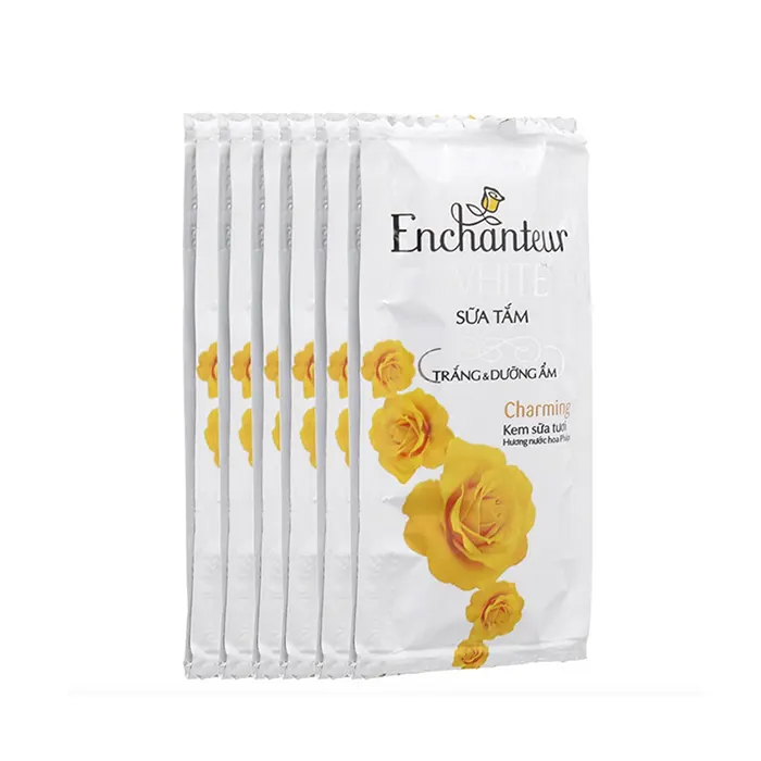 Sữa tắm Enchanteur Charming với hương nước hoa quyến rũ giúp loại bỏ nhẹ nhàng tế bào chết và sắc tố đen xỉn, giúp tái tạo da mới nhanh chóng. Sản phẩm thuộc dạng dây 12 gói. Với công thức mới, sản phẩm chứa gấp đôi lượng Silk Protein nuôi dưỡng da mềm mịn như lụa.
